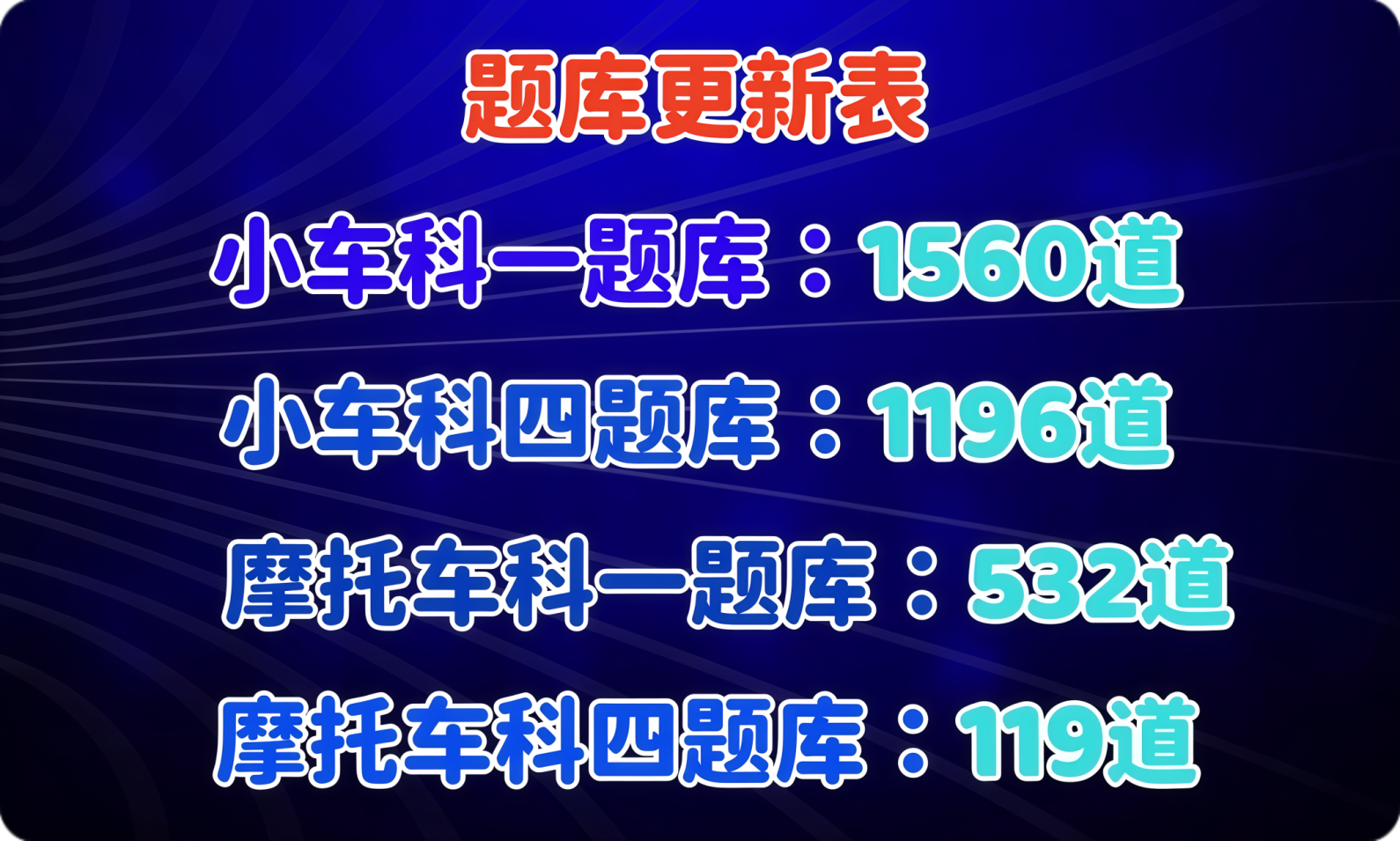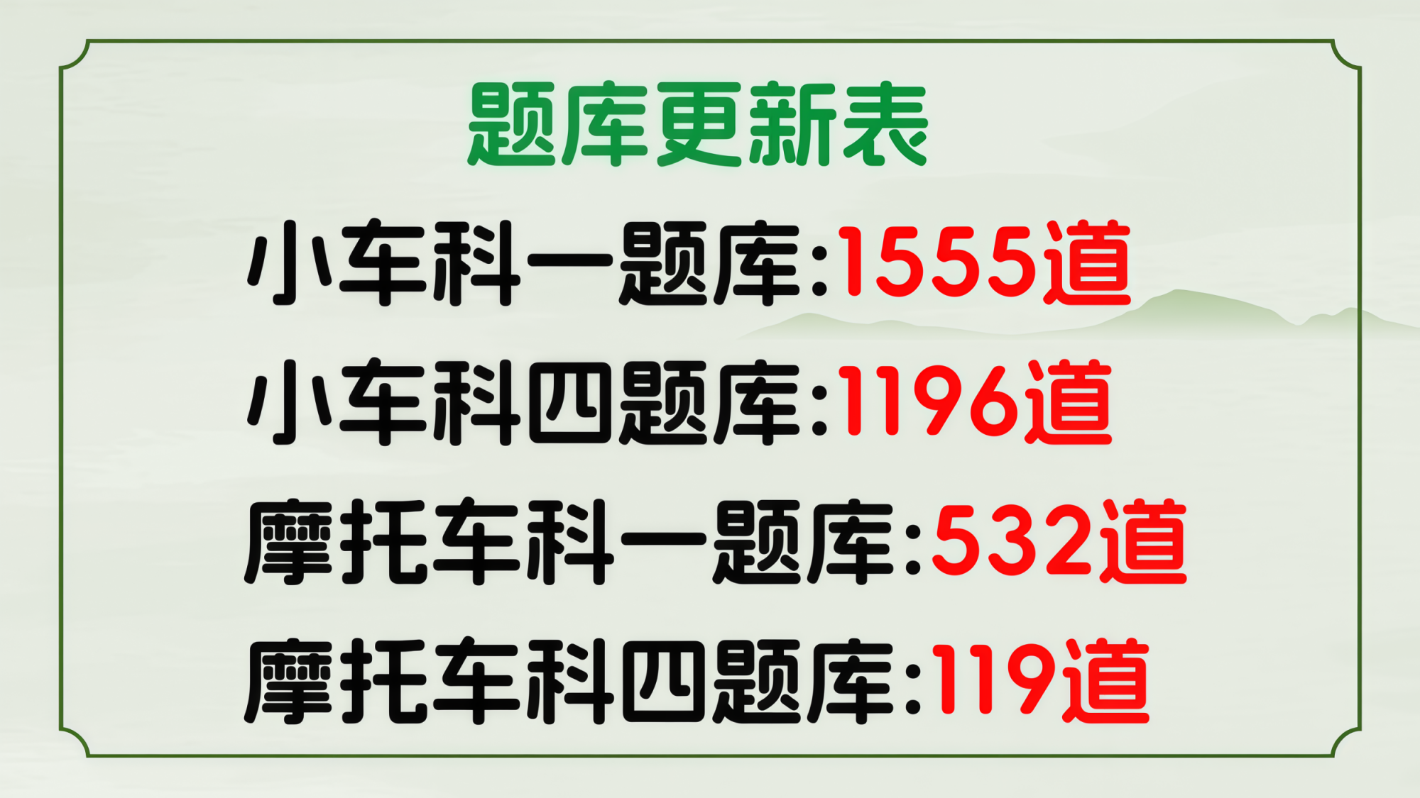 2026年3月1日:小车科一(更换技巧动画讲解11道、对比题10道);小车科四(更换技巧动画讲解8道,更换图片3道)。题库自动更新不需要重新下载。因为我们只做交规软件,所以题少、题真、更新的快。